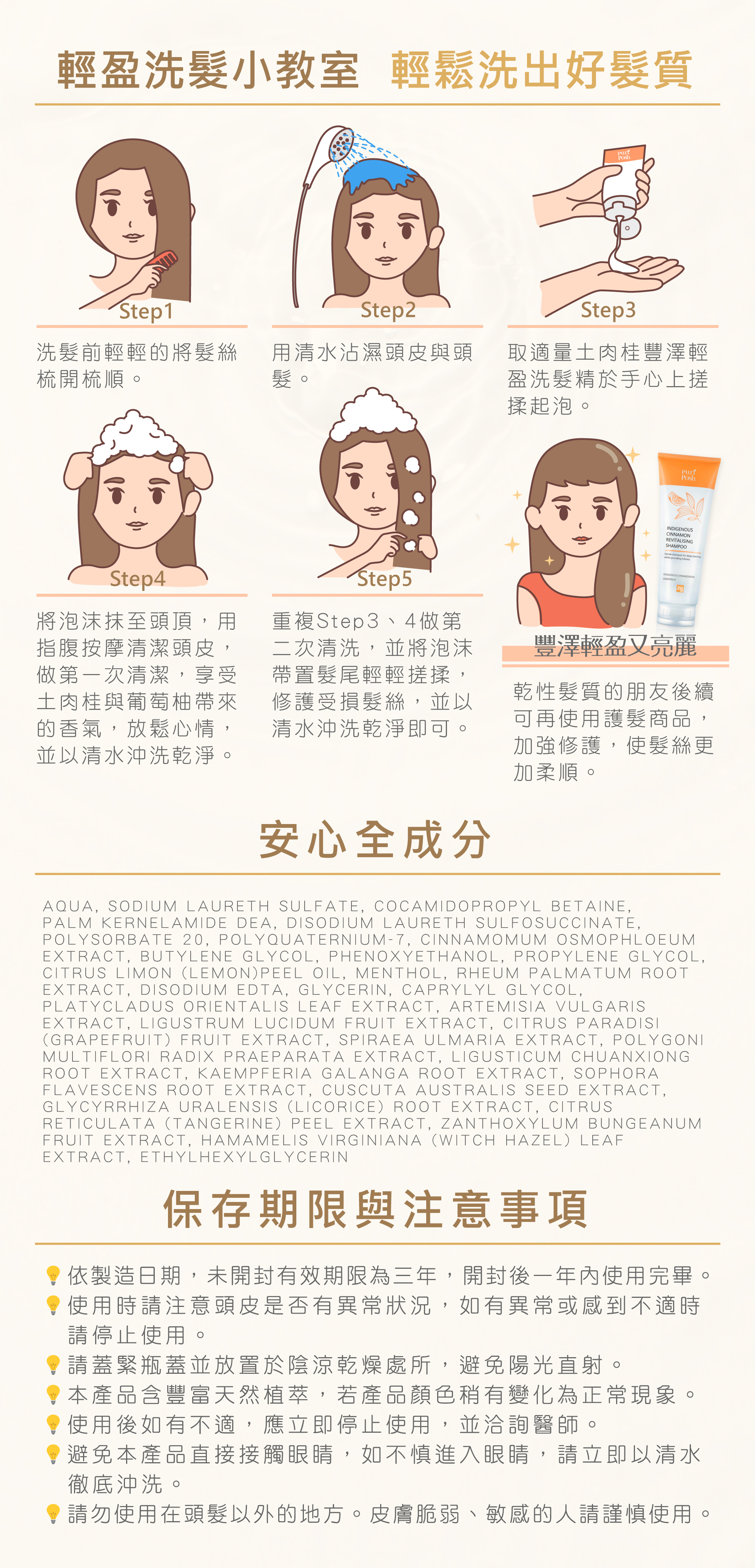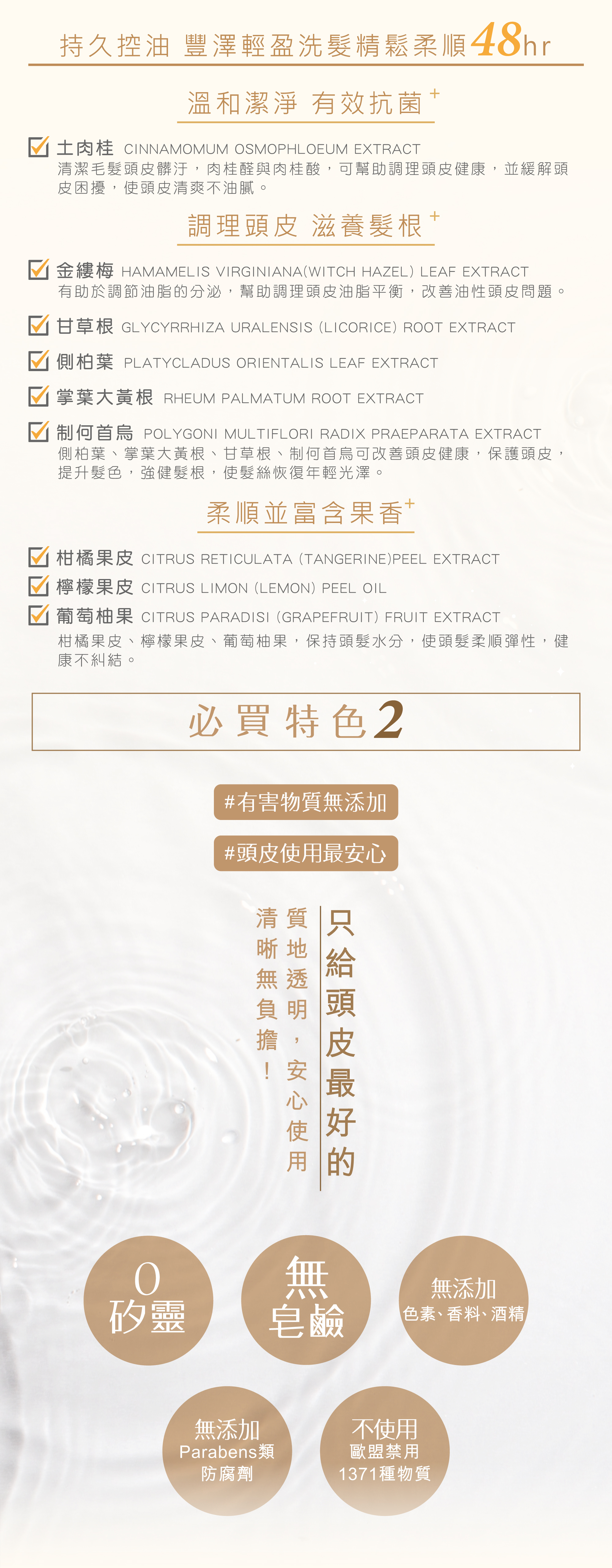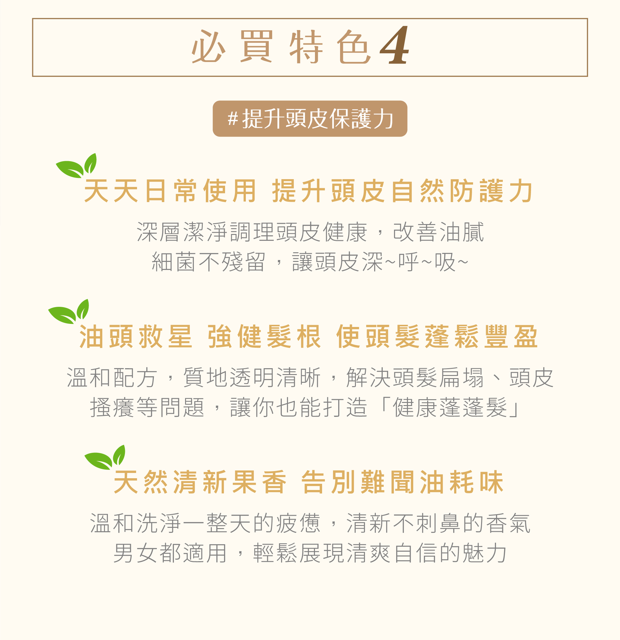 強健髮根、調理頭皮、鎮靜舒緩,使頭髮呈現健康光采及蓬鬆豐盈感。