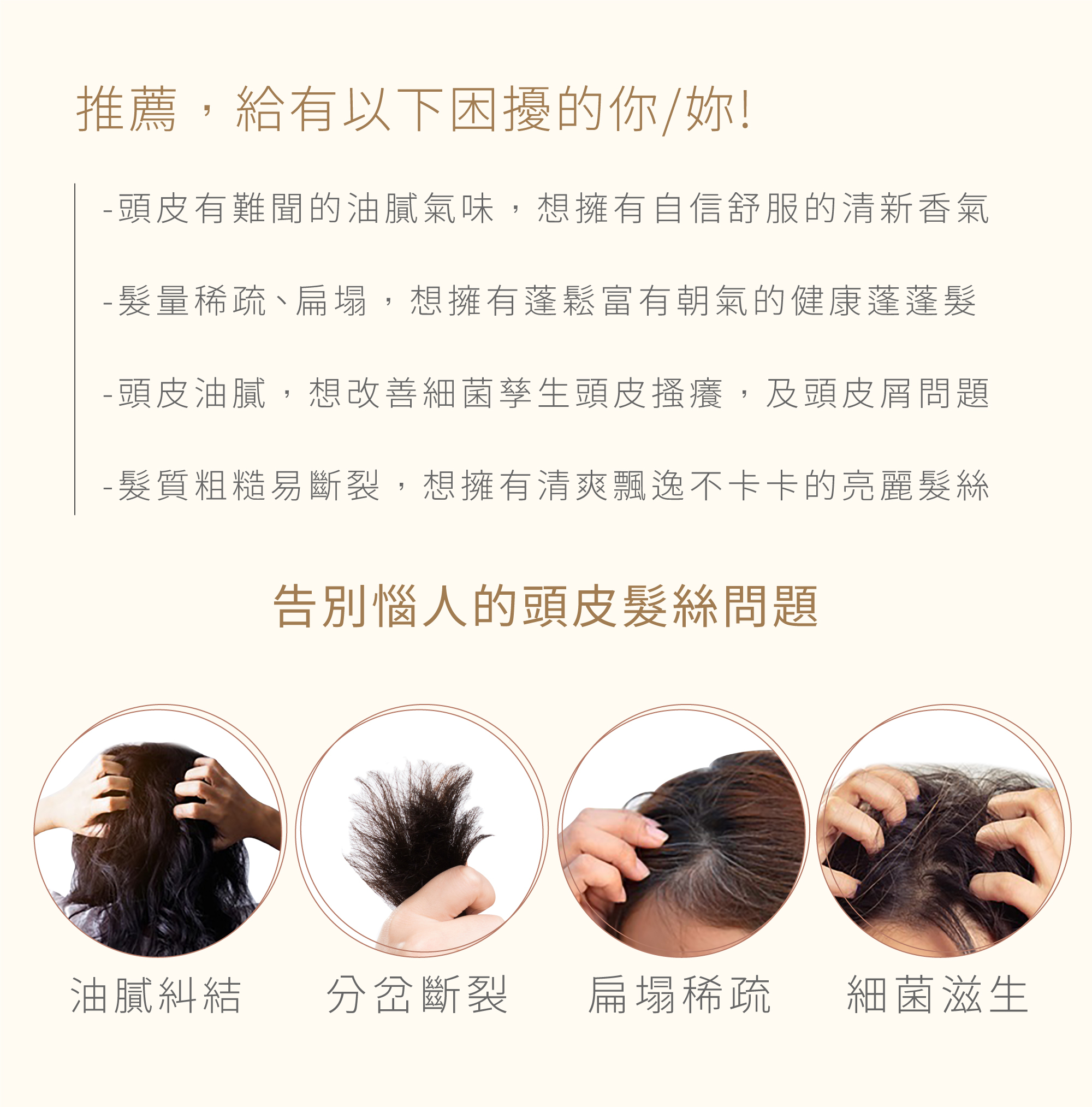 去除頭皮多餘油脂,抑制皮屑芽孢菌,減少頭皮屑產生。